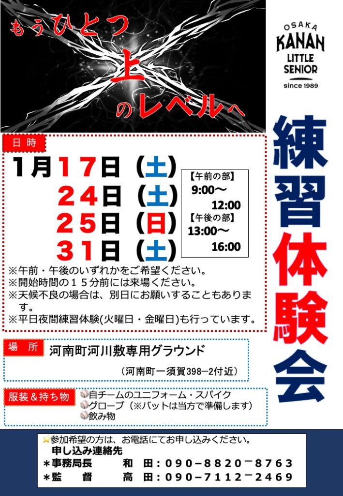 ⚾️練習体験会(1/17.24.25.31)開催します!是非、ご参加ください😄